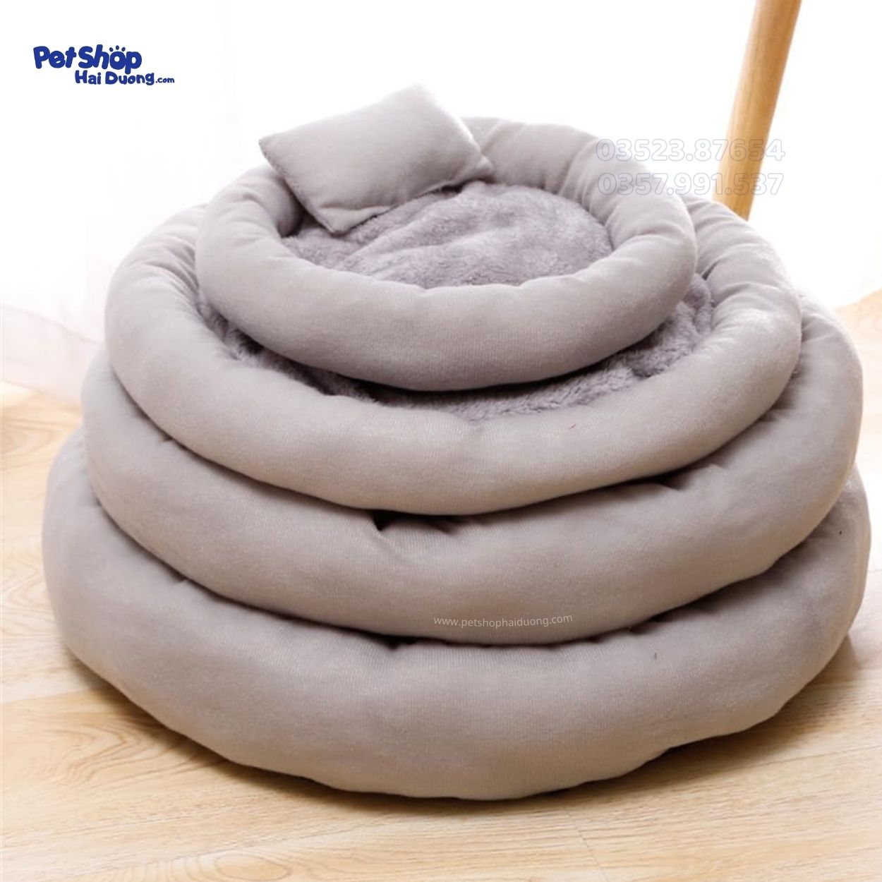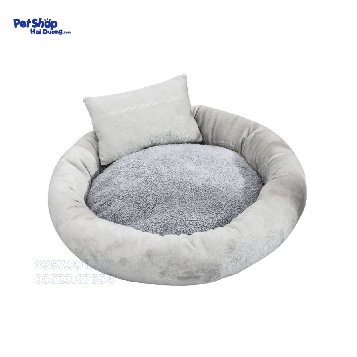 Đệm xám tròn kèm gối cho chó mèo, chất liệu mềm mịn giữ ấm mùa đông, đàn hồi tốt, dễ giặt, giúp thú cưng ngủ ngon và thư giãn suốt ngày dài.