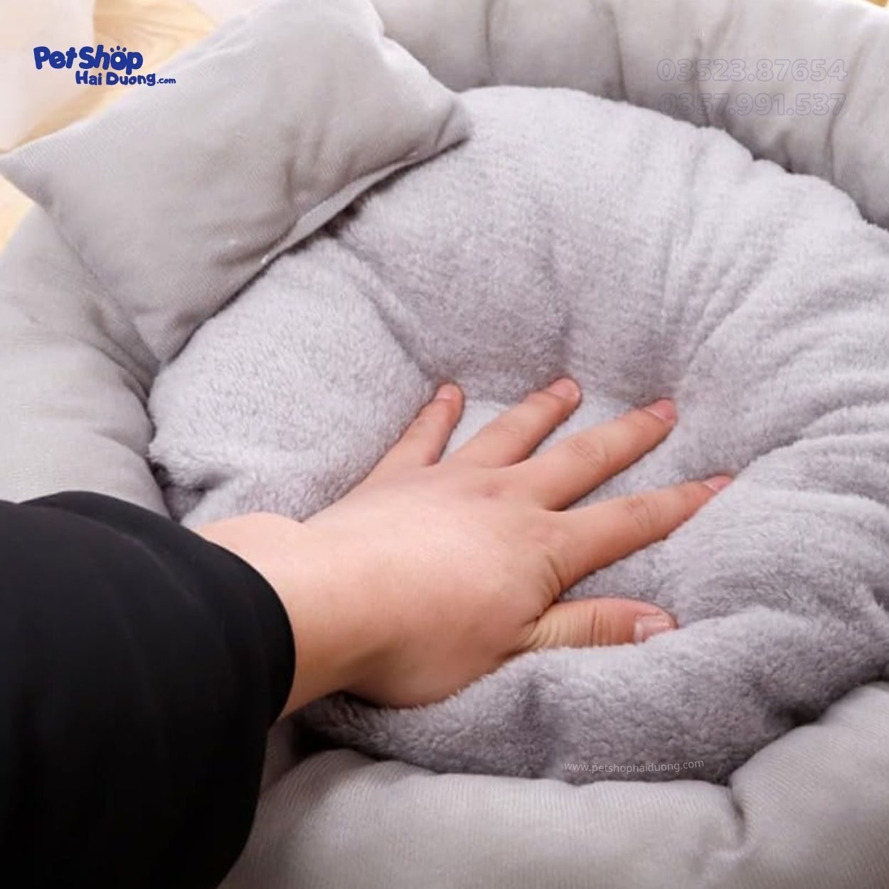 Đệm đi kèm một chiếc gối nhỏ xinh cho thú cưng gối đầu hoặc ôm khi ngủ, tạo cảm giác dễ chịu và ấm áp hơn trong những ngày lạnh. Gam màu xám trung tính giúp sản phẩm luôn sạch sẽ và dễ hòa hợp với mọi không gian sống.